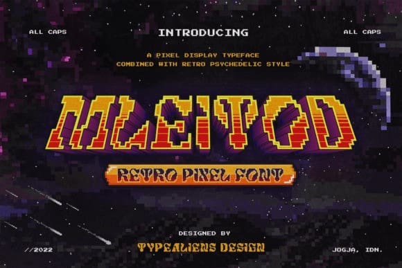 Mleitod Pixel Font is a fun, retro-pixel display font. Its unique style is perfect for game titles, displays, posters, or anything that requires a funky touch.