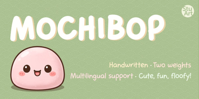 Mochibop Display Font is a rounded, bouncy handwritten font that brings cozy joy and bubbly personality to everything from digital stickers to children’s books. With chunky, marshmallow-like letterforms and a smooth rhythm that flows naturally, it’s like your handwriting got a hug from a mochi.