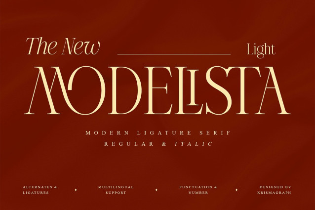 Modelista Light Font is a multipurpose font that is perfect for any project, with high-contrast glyphs, giving it an elegant, feminine and masculine, modern, and easy-to-read quality. It is equipped with a unique ligature to give your designs a new color. Great in layout design for quotes or body copy, best used as a display for headings, editorial, logos, branding, magazines, product packaging, invitations, quotes, blogs, and more. This font is easy to use and has OpenType features.