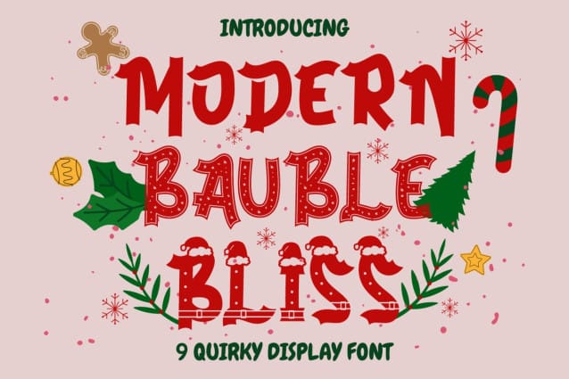 Modern Bauble Bliss Font, a quirky display font that captures the spirit of the holiday season. This font is perfect for adding a touch of whimsy and magic to your designs, whether you’re creating logos, branding, invitations, packaging, posters, titles, or anything else related to Christmas.