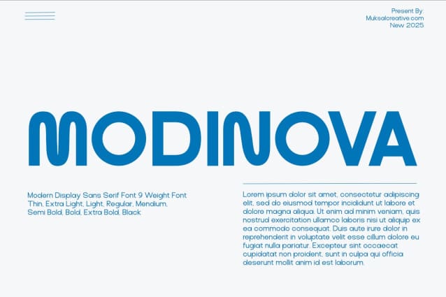 Each character in Modinova is crafted with balanced proportions and subtle details, making it an excellent choice for editorial design, branding, digital interfaces, and more. Its clean geometric design and precise contours give it a professional yet approachable appearance, ensuring readability at all sizes.