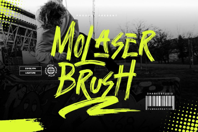 Molaser Brush Font – Ink Brush Font which has a hand lettering brush style. So it looks natural like a handmade. This texture is very detailed. This font is suitable for logos, product branding, printable templates or for text overlay to any background image, also suitable for use in title design. Such as apparel, invitations, books tittle, stationery design, quotes, branding, greeting card, t-shirt, packaging design, poster and more!