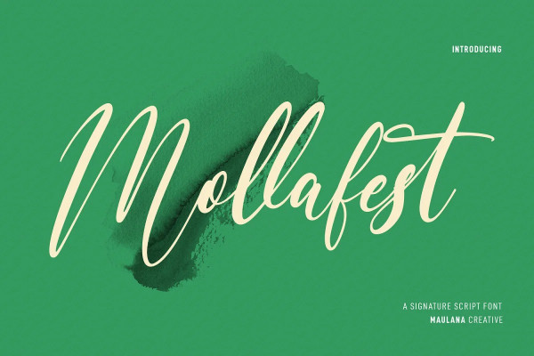 Mollafest Font is a modern script font. With high contrast stroke, fun character with a bit of ligatures. To give you an extra creative work. Mollafest font support multilingual more than 100+ language. This font is good for logo design, Social media, Movie Titles, Books Titles, a short text even a long text letter and good for your secondary text font with sans or serif. Make a stunning work with Mollafestfont.