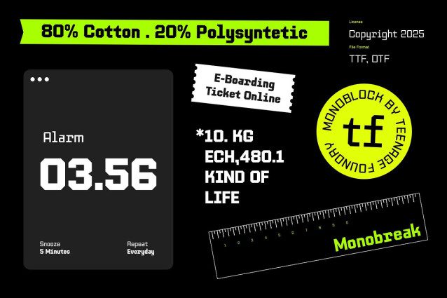 Featuring five weights from Thin to Bold Monobreak offers exceptional versatility for a wide range of uses, from digital interfaces and modern branding to minimal editorial layouts. With its consistent rhythm and sleek construction, Monobreak delivers a sense of stability, clarity, and technical elegance in every line of text.