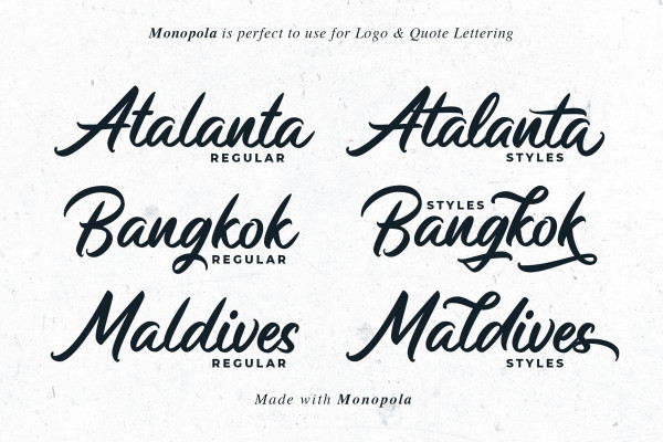 Monopola Script Font, is a casual script font inspired by pop cultures and urban fashion. This font is great for your next creative project such as Logotype, printed quotes, invitations, cards, product packaging, headers, Letterhead, Poster, Apparel Design, Label, and etc.