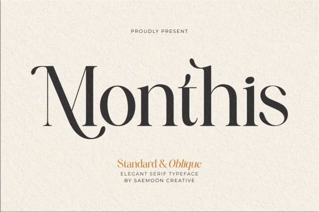 Monthis Font is a premium serif font, perfect for those seeking a blend of simplicity and elegance. With its slim form and clean lines, Monthis conveys a professional and modern feel, making it an ideal choice for product branding, logo design, and marketing materials that require a luxurious and sophisticated touch. The oblique version adds a subtle dynamic accent, bringing a sense of motion without sacrificing elegance. Suitable for editorial design projects, websites, product packaging, and brand identity, Monthis ensures that every design element looks stunning and easy to read, leaving a lasting and powerful impression.