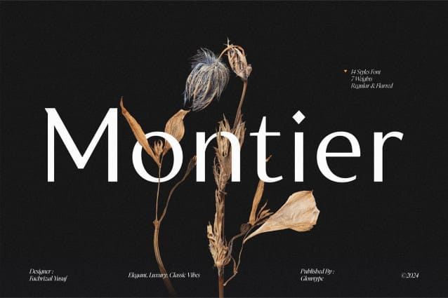 Montier Font Family A Elegant meet Classic Vibes was created to express things in a classic yet glamorous way. Come with two style to give different vibes, Regular to give elegant, luxury and masculine vibes and Flared to give classical and roman vibes.