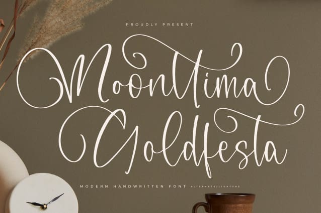 Moonttima Goldfesta Font – Modern Handwritten Font , from Letterena, is a Luxury Script font, suitable for any projects such as: logos, branding projects, homeware designs, product packaging, mugs, quotes, posters, shopping bags, t-shirts, book covers, name card, invitation cards, greeting cards, label, photography, watermark, special events, and all your other luxury and beautiful projects that need a Luxury serif taste.