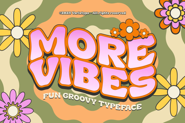 More Vibes Font is a bold, playful, and groovy typeface that brings retro charm and feel-good energy to any design. With its chunky curves, vibrant personality, and nostalgic flair, it’s perfect for posters, branding, social media, or anything that needs a splash of happy 1970s soul. Let your creativity ride the wave of More Vibes!