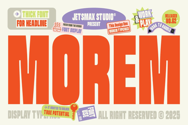 Morem Font is a bold typeface with a distinctive style. Its uniqueness lies in the heavier strokes at the top and bottom of each letter, creating a stable, strong, and solid impression. This design gives Morem a fresh typographic identity, making it perfect for titles, posters, branding, and graphic designs that aim to stand out.