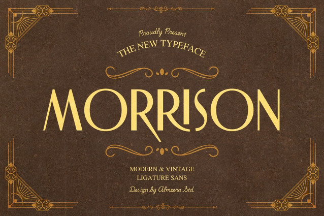 Morrison Font is a tribute to the decorative arts and architecture movement that emerged in the 1920s, evolving into a defining style of the 1930s across Western Europe and the United States. This luxurious font is meticulously crafted with precision, designed to capture a sleek, semi-modern elegance that reflects the glamour and sophistication of vintage aesthetics. Blending modernist influences with exquisite craftsmanship, Morrison is enhanced by stunning ligatures that add a refined touch.