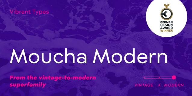 Moucha Modern Font Family is a geometric typeface family with a static look. The equalized character widths, like the wide ‘n’, give it a contemporary appeal. It is part of the Moucha vintage-to-modern superfamily, which received the German Design Award 2024 for its multitude of variants. It supports 890 Latin, Cyrillic, and Greek languages.