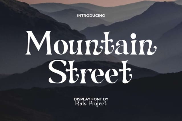 Mountain Street Font is a stylish serif display font. The little waves at each end of the letters make it look modern and a bit vintage at the same time. It will be good for any designs, such as billboard, brand logo, business card, cover, custom design, invitation, label, magazine, menu, poster, product packaging, quote, signage, web, and more!