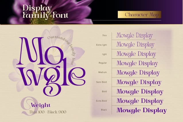 Mowgle Font, a beautiful serif font that blends timeless elegance with a touch of fantasy. Its smooth, flowing curves bring a graceful and feminine charm, while the bold yet refined letterforms ensure perfect readability. The unique character shapes, adorned with subtle decorative details, make Mowgle a perfect choice for designs that demand both beauty and distinction. With 9 weight variations from Thin to Black, plus alternates and ligatures, Mowgle Font offers versatility and creative freedom. Whether for wedding invitations, fantasy book covers, luxury branding, or editorial designs, this font will bring an enchanting and refined look to any project. Let your creativity flow with Mowgle – a typeface that tells a story of elegance and imagination.
