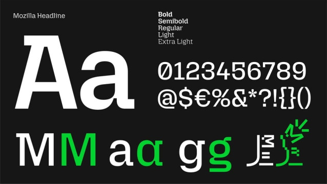 Mozilla Headline Font Family. This typeface font family features a unique uniwidth design. It maintains standardized spacing and kerning across all weights and styles, eliminating risk of text reflow to preserve the integrity of the layout and en-hance the user’s experience.
