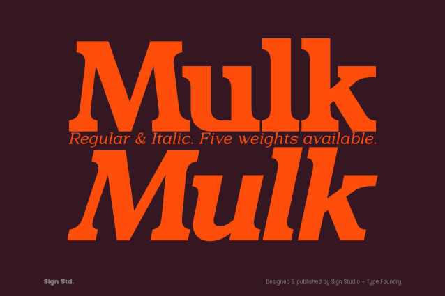 Unlike many experimental slab serifs, Mulk maintains a solid and straightforward character. This typeface family includes five weights along with corresponding italics, providing designers with the flexibility needed for impactful headlines and confident, readable text.