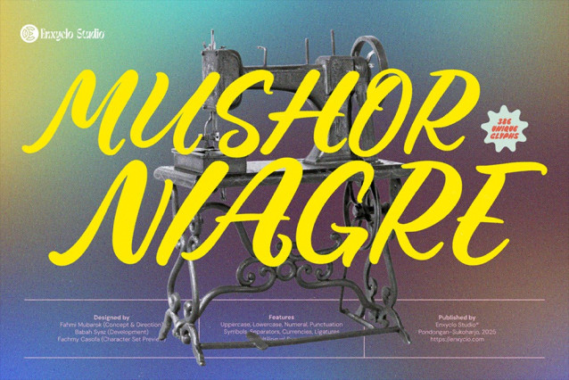 Mushor Niagre Font is an expressive brush script font with a strong vintage and handmade feel. Inspired by classic handwritten styles full of character, this font delivers a dynamic yet elegant impression—perfect for design projects that aim to stand out with style and class. Mushor Niagre offers flexibility and uniqueness to strengthen your brand’s visual identity. Ideal for retro-themed designs, fashion editorials, handmade product labels, or branding that seeks a truly authentic touch.
