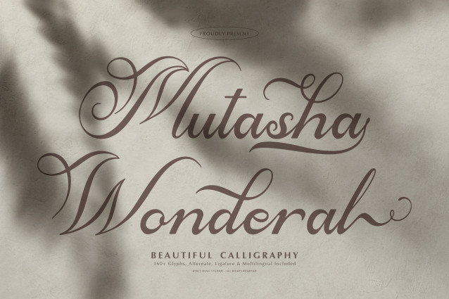 Mutasha Wonderal Font | Beautiful Calligraphy, from Denustudios, suitable for any projects such as: logos, branding projects, homeware designs, product packaging, mugs, quotes, posters, shopping bags, t-shirts, book covers, name card, invitation cards, greeting cards, label, photography, watermark, special events, and all your other lovely projects that need a Beautiful Calligraphy taste.