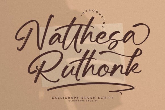 Natthesa Ruthonk Font – Calligraphy Brush Script. This lovely handwritten typeface is perfect for logos, branding projects, homeware designs, product packaging, mugs, quotes, posters, shopping bags, t-shirts, book covers, name cards, invitation cards, greeting cards, labels, photography, watermark, special events, and more.
