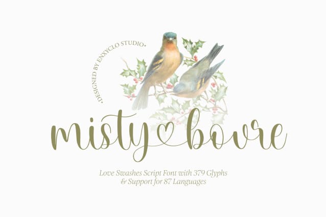 NCL MISTY BOUVRE FONT is a unique script font. Masterfully designed to become a true favorite, this font has the potential to bring each of your creative ideas to the highest level! It was purposely crafted to be used in large point sizes, although it doesn’t lose its magic in small point sizes. It is perfect for wedding, headline, billboard, magazines, website, titles, poster, branding, and logos. No matter the topic, this font will be an incredible asset to your fonts’ library, as it has the potential to elevate any creation. With this beautiful font, absolutely you can make your project stand out from the rest.