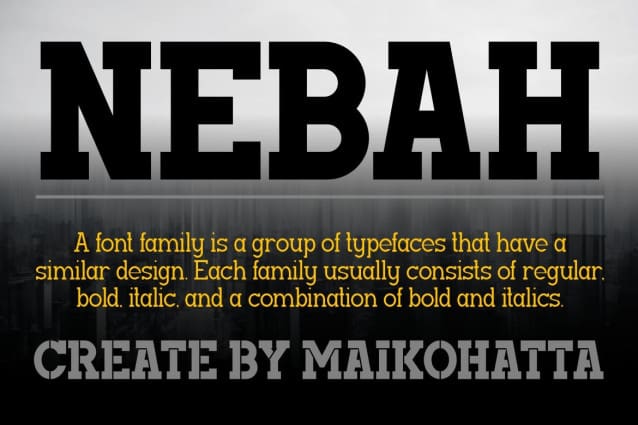 Nebah Font – Modern Family Typeface. This font has a series of small or decorative projections called serifs at the ends of its characters. Serifs provide a more formal, classic, and easy-to-read appearance to printed text. Serif fonts are often used in formal documents, books, and print publications because of their good legibility at small text sizes.