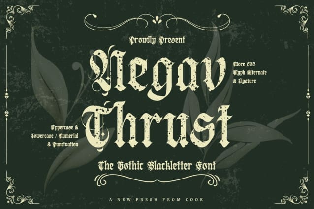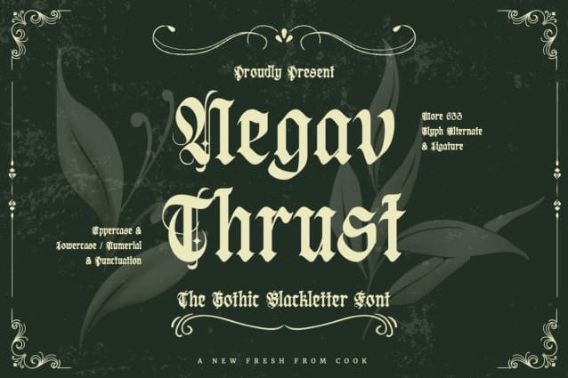 Negav Thrust Font – Gothic Balckletter Font. This Font can be used for various purposes such as Magazine Title, Poster, Logo, T-Shirt, Sub Title, Business cards, Magazines, Book Covers, Wedding Invitations,Templates Instagram Story Post, Greeting Cards, Quotes, etc.