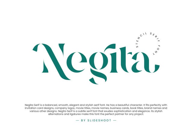 Negita Font – Stencil Serif Font is a balanced, smooth, elegant and stylish stencil serif font. He has a beautiful character. It fits perfectly with invitation card designs, company logos, movie titles, movie names, business cards, book titles, brand names and various other designs. Negita Font – Stencil Serif is a subtle stencil serif font that exudes sophistication and elegance. Its stylish alternations and ligatures make this font the perfect partner for any project.