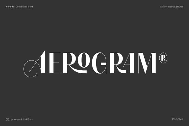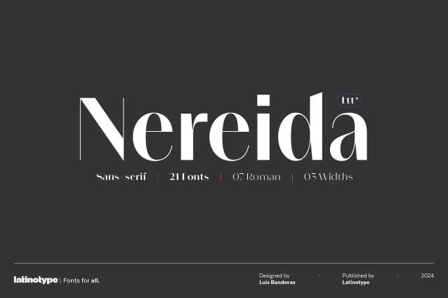 Nereida Font Family is a delicate, luminous and dainty typeface endowed with an expressive and versatile personality. Its high-contrast design positions it as the preferred choice for elegant and creative typographic compositions. Nereida stands out for a generous x-height structure, thus ensuring an exceptional readability in paragraphs of moderate length. It distinguishes itself with delicately crafted terminals and a set of attractive ligatures and initial letters that expand their ranges of use.