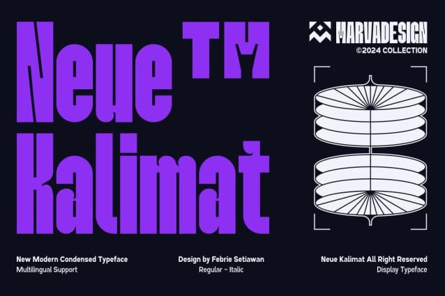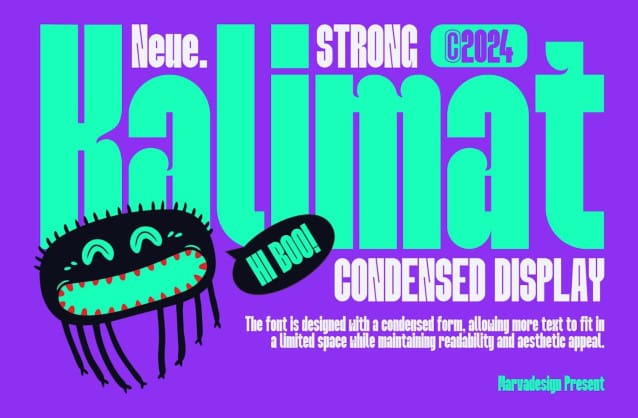 Neue Kalimat Font – Condensed Display, a modern sans serif typeface designed for impactful, high visibility use. This font stands out for its unique character details, making it a great choice for headlines, posters, and other display purposes. The font is designed with a condensed shape, allowing more text to fit into a smaller space while maintaining readability and aesthetic appeal. Distinctive features One of the defining characteristics of the Neue Kalimat Condensed Display is the presence of distinctive features in certain characters.