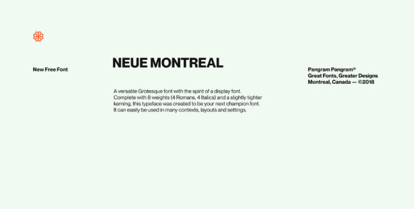 Neue Montreal Font !It is designed and shared by Pangram Pangram. A versatile Grotesque font with the spirit of a display font. Complete with 8 weights (4 Romans, 4 Italics) and a slightly tighter kerning, this typeface was created to be your next champion font. It can easily be used in many contexts, layouts and settings.