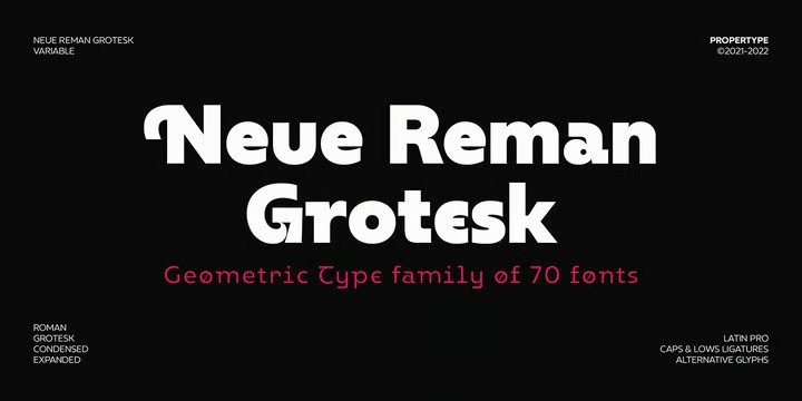 Neue Reman Gt Sans Serif Font Family, contains 750 glyphs, a Latin Pro Fonts. This is the second version of Neue Reman Family. Complete with Stylistic Alternates, Stylistic Set, Caps Swashes Letter, Standard Ligatures, Discretionary Ligatures, Tabular Figures, Proportional Figures, Superscript, Subscript, Scientific Inferiors, Fractions, Ordinals, Arrows and a variety of figures and fractions. Neue Reman typeface suitable to use in multipurpose projects such as on websites, systems, printing, embedding, servers, screens, display, digital-ads, branding, logos, titles, headlines, teks, and everything else.