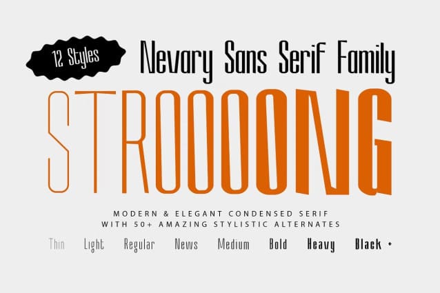 Nevary font family offering multiple styles and multilingual support, elevates your digital and print creations with a unique modern and vintage flair. This font works in large and small sizes and includes 12 styles from thin to extra black. They feature 50+ unique alternates, multilingual support, and various weights.