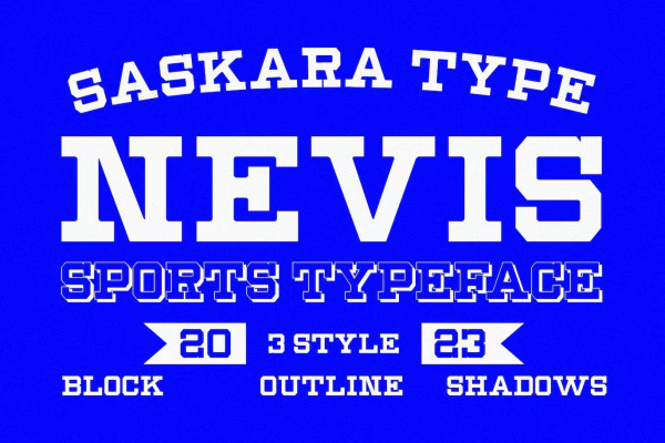 Nevis Font is a vintage-style seriff font with a modern twist that’s strong and vibrant. This font consists of three styles: block, outline, shadows. An ideal font for printing logos, labels, flyers, brochures, signage, pubs, barber shops, craft brands, anything modern style, vintage style, etc.