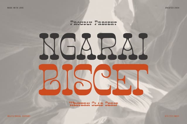 Ngarai Biscet Font | Western Slab Serif, from Denustudios, suitable for any projects such as: logos, branding projects, homeware designs, product packaging, mugs, quotes, posters, shopping bags, t-shirts, book covers, name card, invitation cards, greeting cards, label, photography, watermark, special events, and all your other lovely projects that need a Western Slab Serif taste.