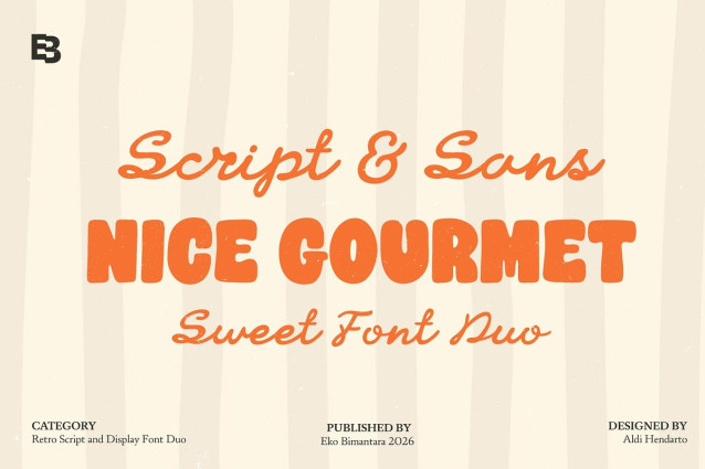 Nice Gourmet Sans Font is a charming font duo that blends a smooth handwritten script with a bold, rounded sans serif, creating a perfect balance between elegance and playfulness. The script style delivers a sweet, friendly, and personal touch, while the sans serif brings strong readability and visual impact. Together, they form a harmonious pairing ideal for eye-catching headlines and expressive branding. Designed with a warm and appetizing personality, Nice Gourmet is especially suitable for food and beverage branding, café menus, packaging, logo designs, posters, social media graphics, and lifestyle products. Its soft curves and cheerful character make it feel inviting and modern, while still maintaining a professional finish. Whether used separately or as a duo, Nice Gourmet helps your designs look delicious, fun, and full of personality.