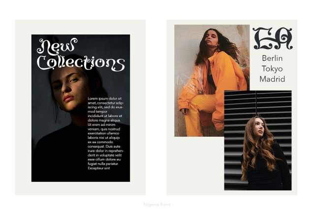 Nigona Display Font inspired by the typography from 70’s style, vintage look high contrast serif that is at home in high-end fashion and cultural environments you can explore and combine. This font is very perfect for many display purposes in your product design if you want to a vintage and classic style. Such as book covers, product labels, logos badges, drink bottles, tattoo shop, coffee shops, fashion products, wedding invitation, etc.