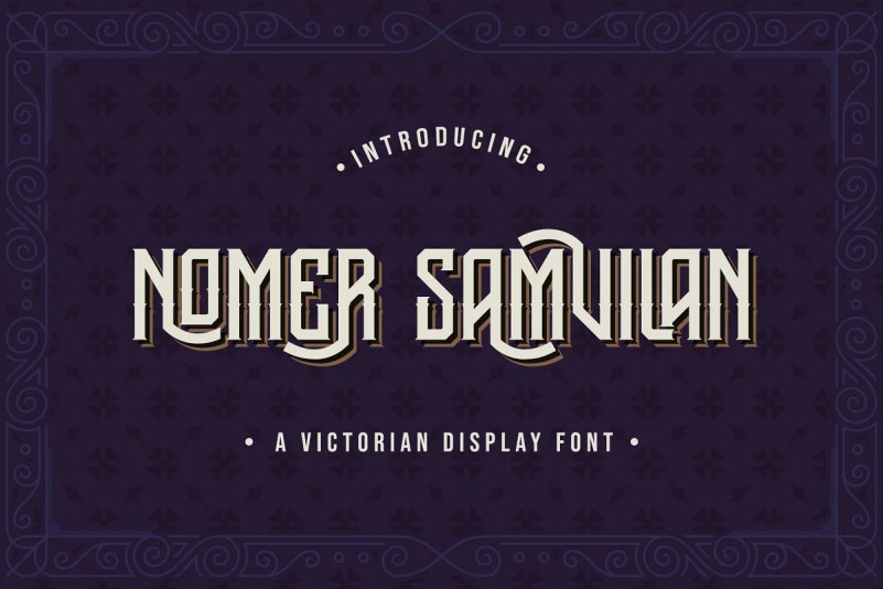 Nomer Samvilan – Victorian Display Font is a unique, vintage and elegant decorative font with victorian style. This Font feels playfully nostalgic and delivers an incredible vintage aesthetic. Inspired by vintage tattoo design, Nomer Samvilan is an absolutely stunning and eye-catching typeface. This typeface will look truly outstanding in a wide range of modern and classic designs, with its romantic and bold formation, as well as its attention to detail