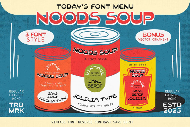 Noods Soup Font, a typeface that captures the playful spirit of classic retro lettering while remaining relevant for today’s design needs. With its charming details and timeless appeal, this font is designed to bring instant character and personality to your work.