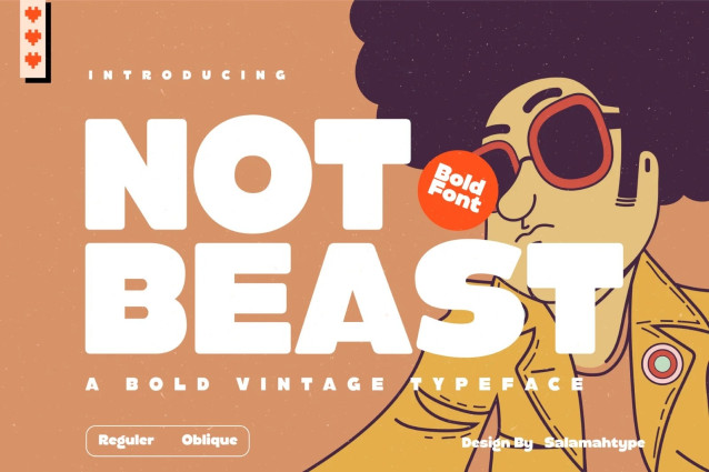 Not Beast Font is a strong and retro-inspired bold typeface that brings a touch of vintage flair to your designs. With its chunky letterforms and playful style, this font is perfect for posters, logos, packaging, album covers, apparel, and eye-catching headlines.