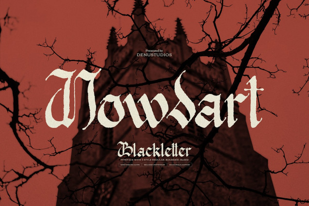 Nowdart Blackletter Font, from Denustudios, suitable for any projects such as: logos, branding projects, homeware designs, product packaging, mugs, quotes, posters, shopping bags, t-shirts, book covers, name card, invitation cards, greeting cards, label, photography, watermark, special events, and all your other lovely projects that need a Blackletter taste.