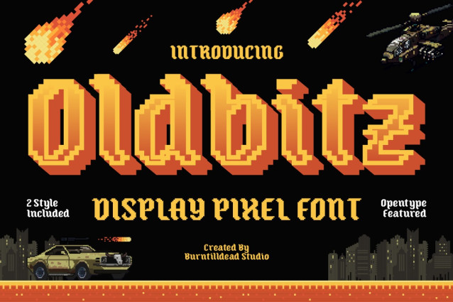 Oldbitz Pixel Font – This bold display font mixes retro arcade vibes with chunky pixel strokes and a touch of vintage gothic style. Oldbitz comes in 2 styles to fit your creative mood, Regular (clean, strong, and perfect for straightforward titles). Shadow (playful, bold, with a retro 3D arcade punch). So if you’re designing game covers, posters, album art, or anything that craves nostalgic vibes, Oldbitz will make your design unique and stand out. Bring back the pixels, bring back the fun.