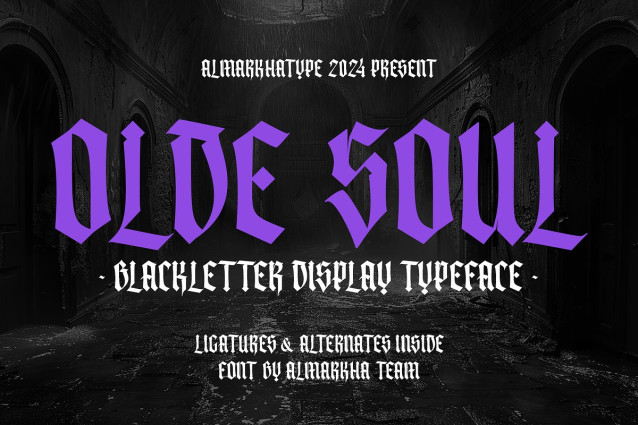 Olde Soul Font is a vintage font inspired by the textura blackletter calligraphy style, featuring a minimalist vicious touch. This typeface combines the traditional intricacies of medieval script with contemporary design elements, resulting in a unique and versatile aesthetic. Its ornate, angular characters evoke a sense of history and sophistication, making it perfect for projects that require a blend of classic elegance and vicious design. Ideal for use in branding, logos, posters, and other creative works.