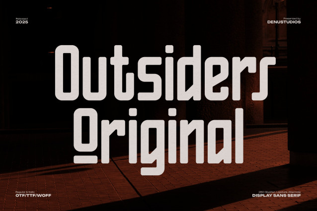 Outsiders Original | Display Sans Serif, from Denustudios, suitable for any projects such as: logos, branding projects, homeware designs, product packaging, mugs, quotes, posters, shopping bags, t-shirts, book covers, name card, invitation cards, greeting cards, label, photography, watermark, special events, and all your other lovely projects that need a Display Sans Serif taste.