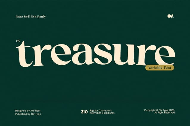 OV Treasure Font Family is a retro serif font designed to bring the aesthetics of the vintage era to life with a modern twist. Featuring bold characters, curved letterforms, and unique detailing, this font strikes the perfect balance between nostalgia and elegance. It’s perfect for various design projects, including branding, posters, packaging, magazine headlines, and retro-themed websites.