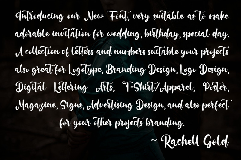 Rachell Gold Script Font by @font_kong 23,873 downloads Found in: Calligraphy Fonts, Script Fonts Rachell Gold Script Font