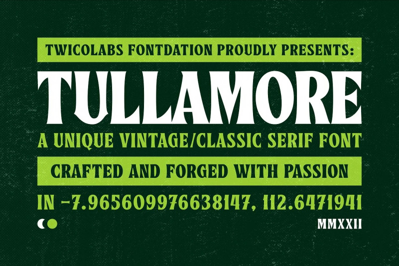 Tullamore Vintage Font by Twicolabs Fontdation 10,404 downloads Found in: Display Fonts, Retro / Vintage Fonts, Serif Fonts Tullamore Vintage Font