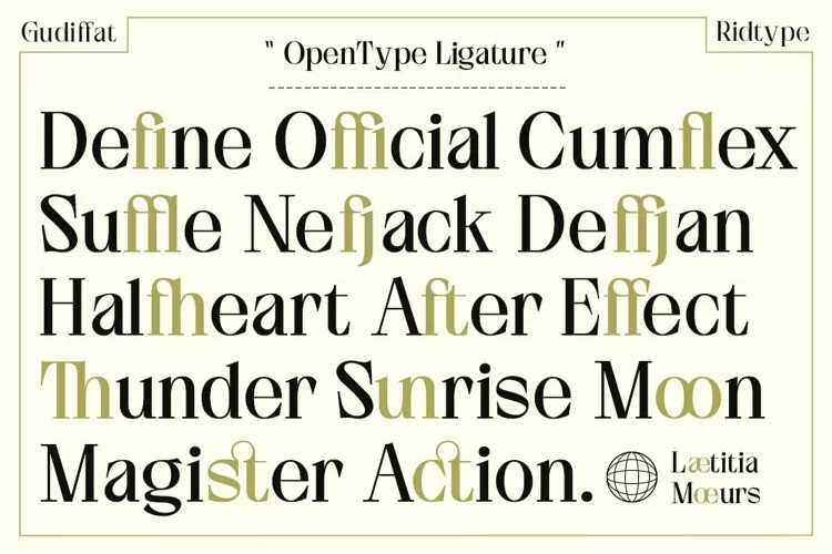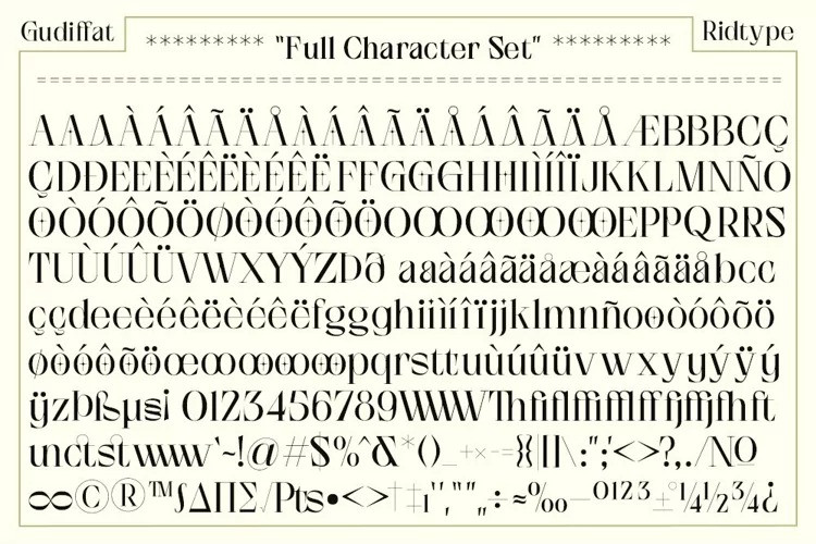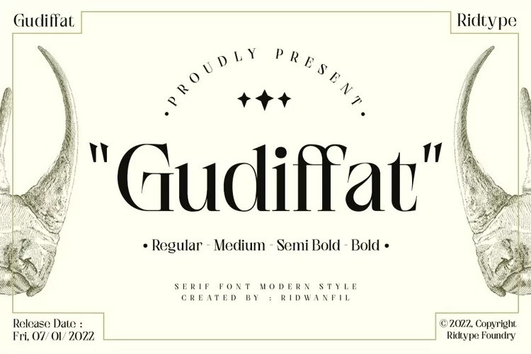 Gudiffat Serif Font by DESIGNED BY Ridtype 18,522 downloads Found in: Serif Fonts, Style / Aesthetic Fonts Gudiffat Serif Font