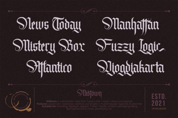 Midtown Blackletter Font by omotu studio 18,791 downloads Found in: Blackletter / Gothic Fonts Midtown Blackletter Font