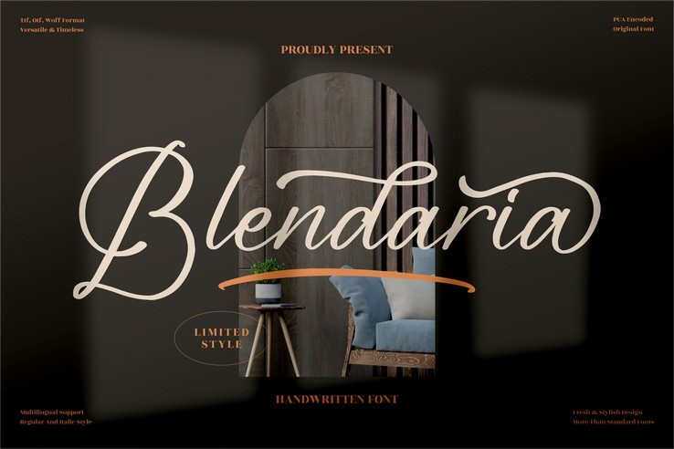 Blendaria Calligraphy Font by Perspectype Studio 20,523 downloads Found in: Calligraphy Fonts, Script Fonts Blendaria Calligraphy Font
