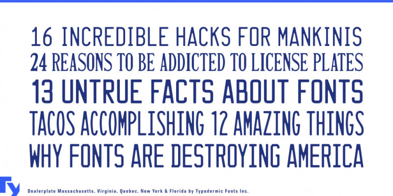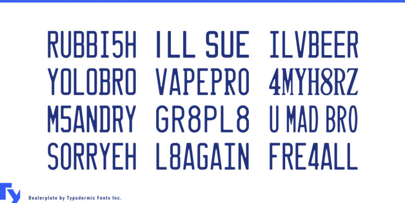 Dealerplate California Font by Typodermic Fonts 19,219 downloads Found in: Sans Serif Fonts, Style / Aesthetic Fonts Dealerplate California Font